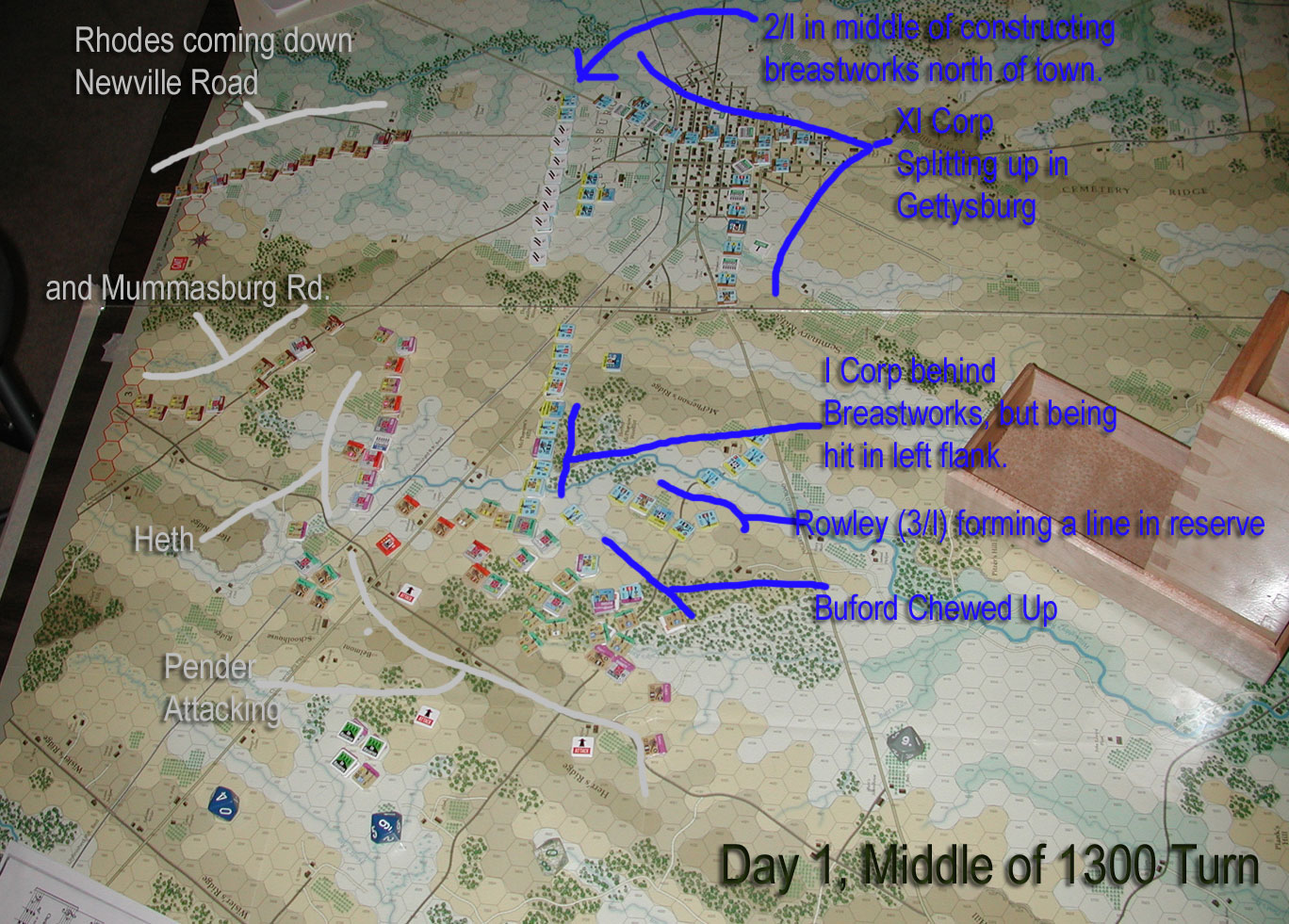 After a morning of maneuver the battle is joined as Pender chews through Buford and starts to inflict damage to the I Corp. The Union command is worried they maybe too extended.