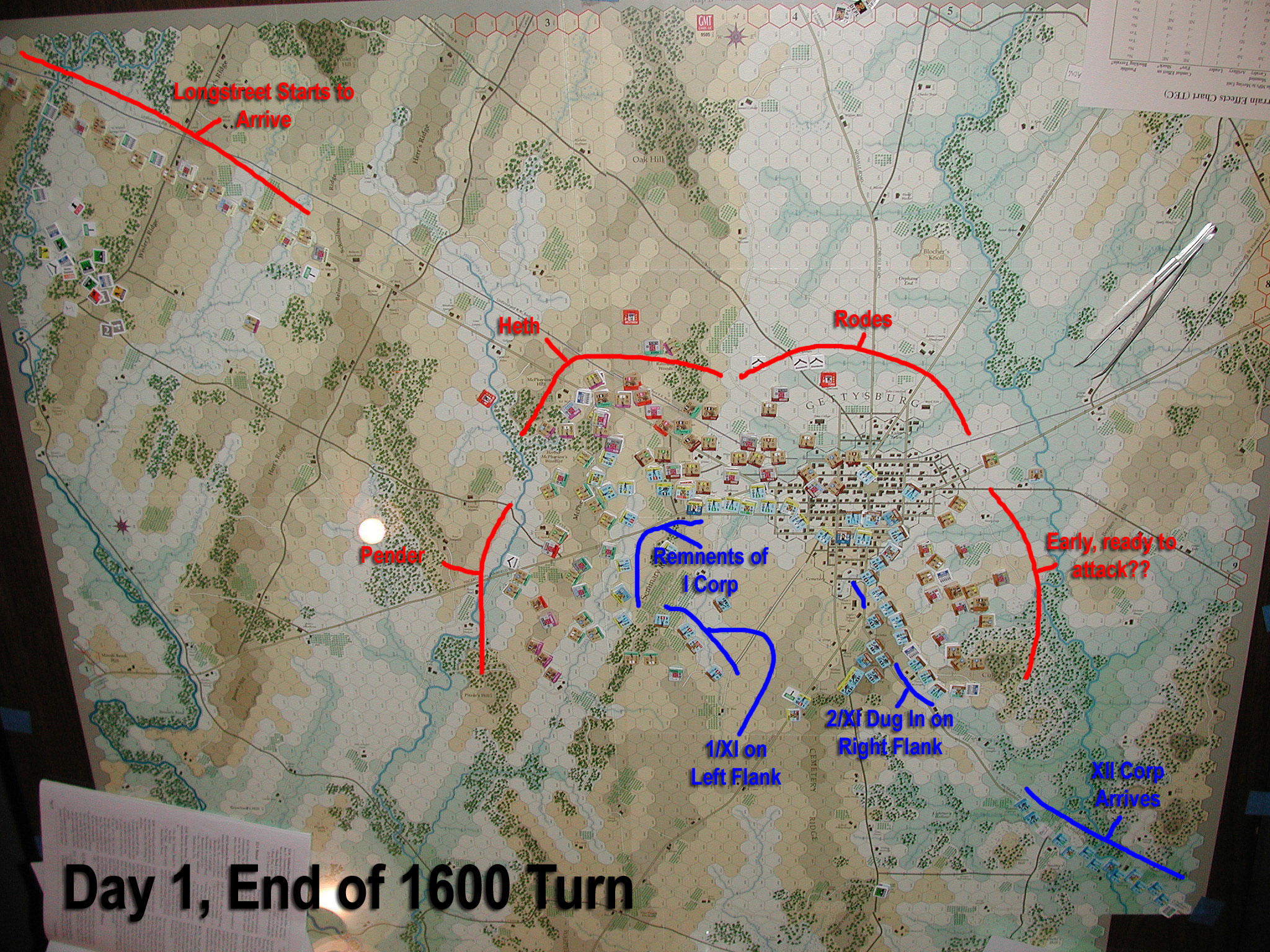 On the Union right, Early must decide whether or not to attack the dug in 2/XI protecting Cemetery Hill. Culps Hill looks open for the taking.